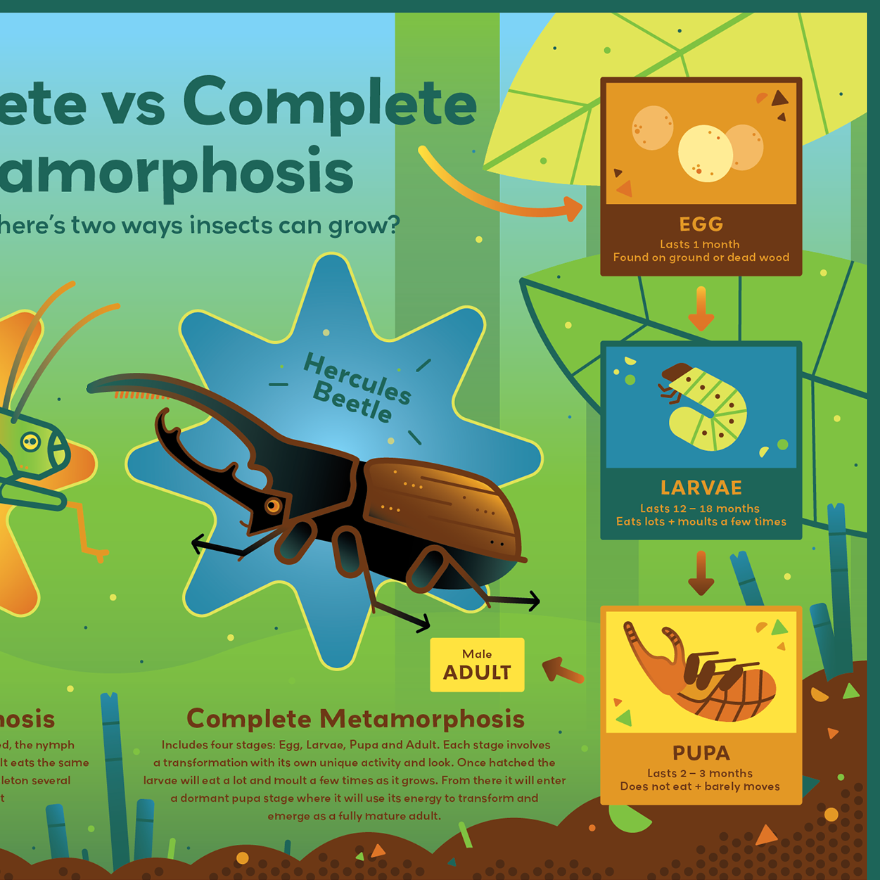 Did you know there’s two ways insects can grow? Peek into how bugs develop with this infographic poster designed for the Victoria Bug Zoo as a teaching aid!